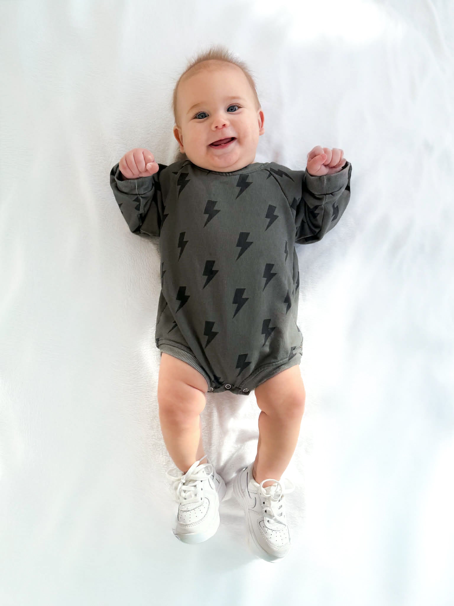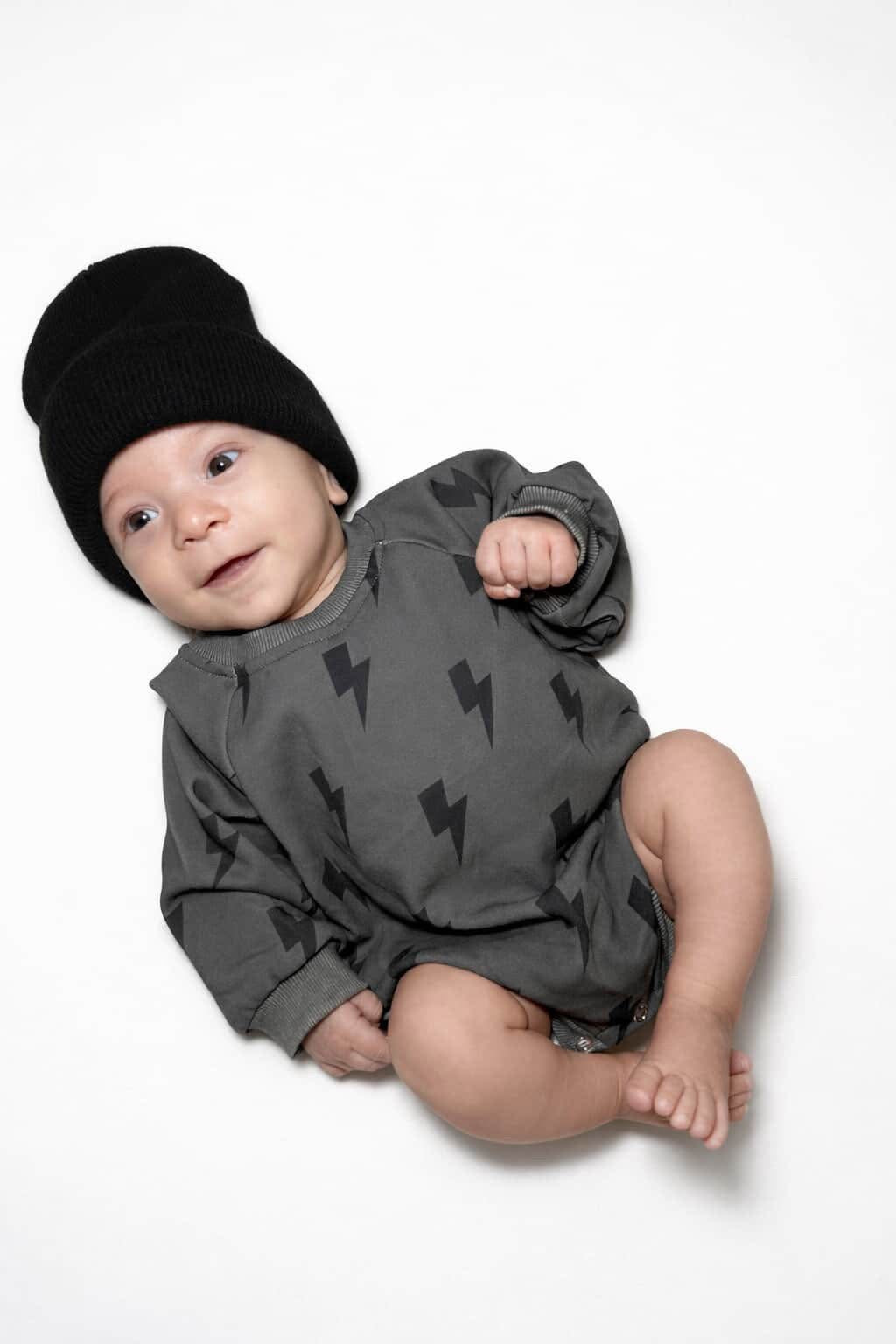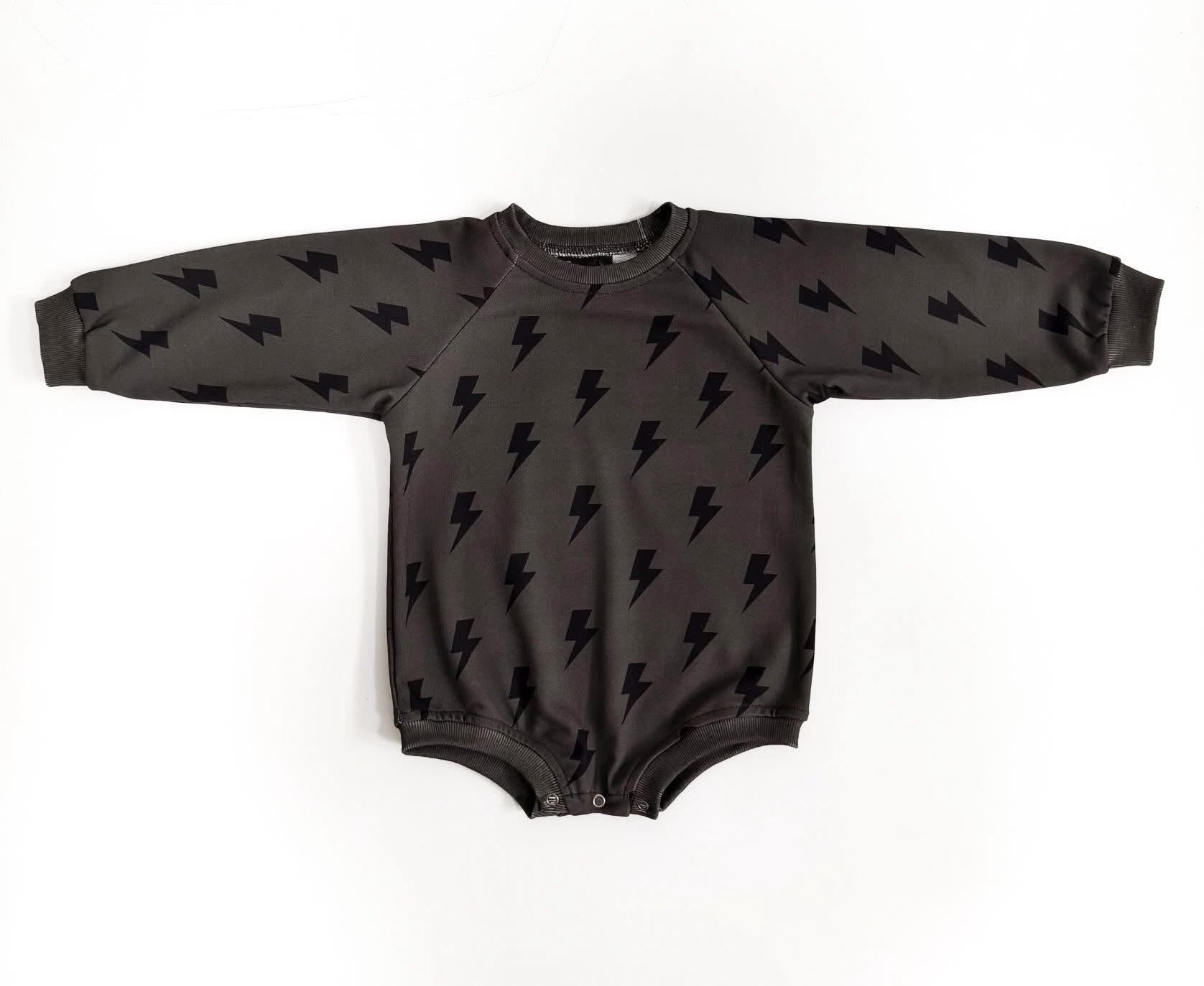 This sweet bubble romper is made for everyday play with standout style. Soft, stretchy and the perfect extra layer for the cooler months, but is lightweight enough for Spring wear. The charcoal toned background provides a modern style with the bold bolts providing an effortlessly cool look.