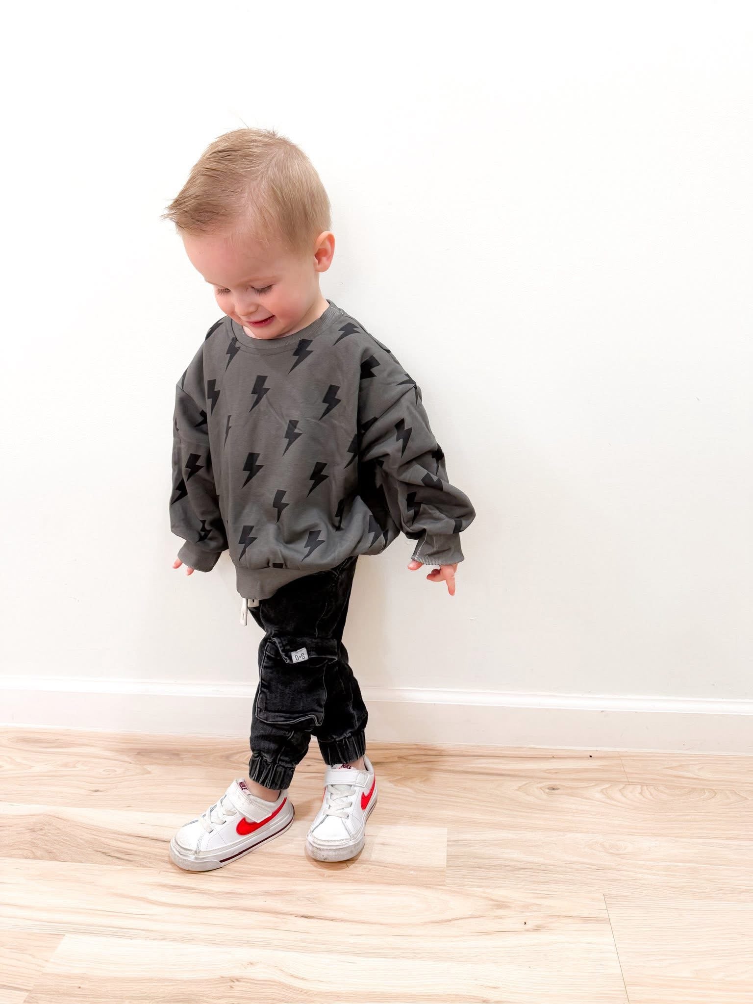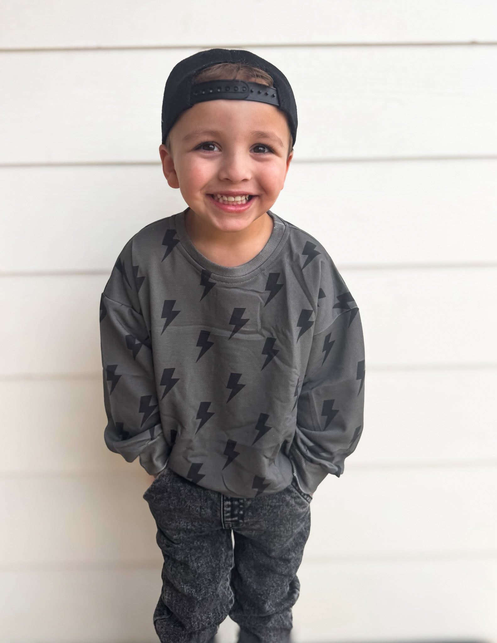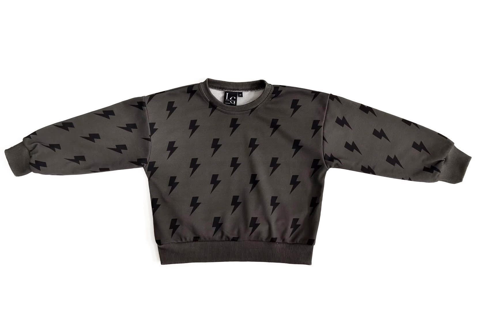 This everyday crew is made for everyday play with standout style. A soft stretchy crewneck sweatshirt that is the perfect extra layer for the cooler months, but is lightweight enough for Spring wear. The charcoal toned background provides a modern style with the bold bolts providing an effortlessly cool look.