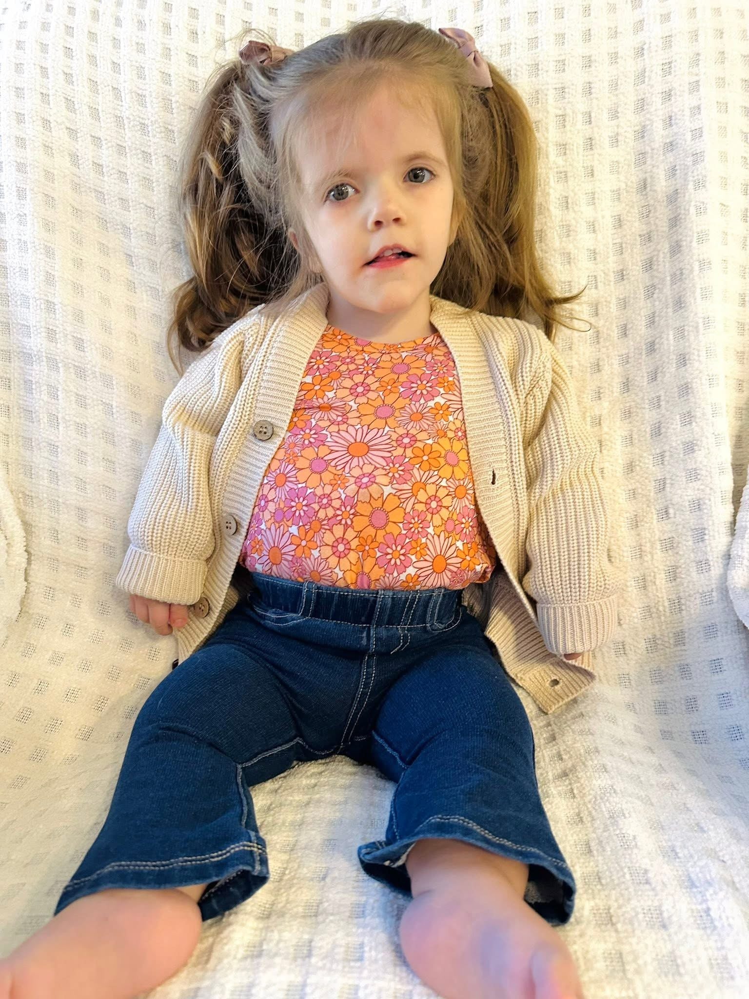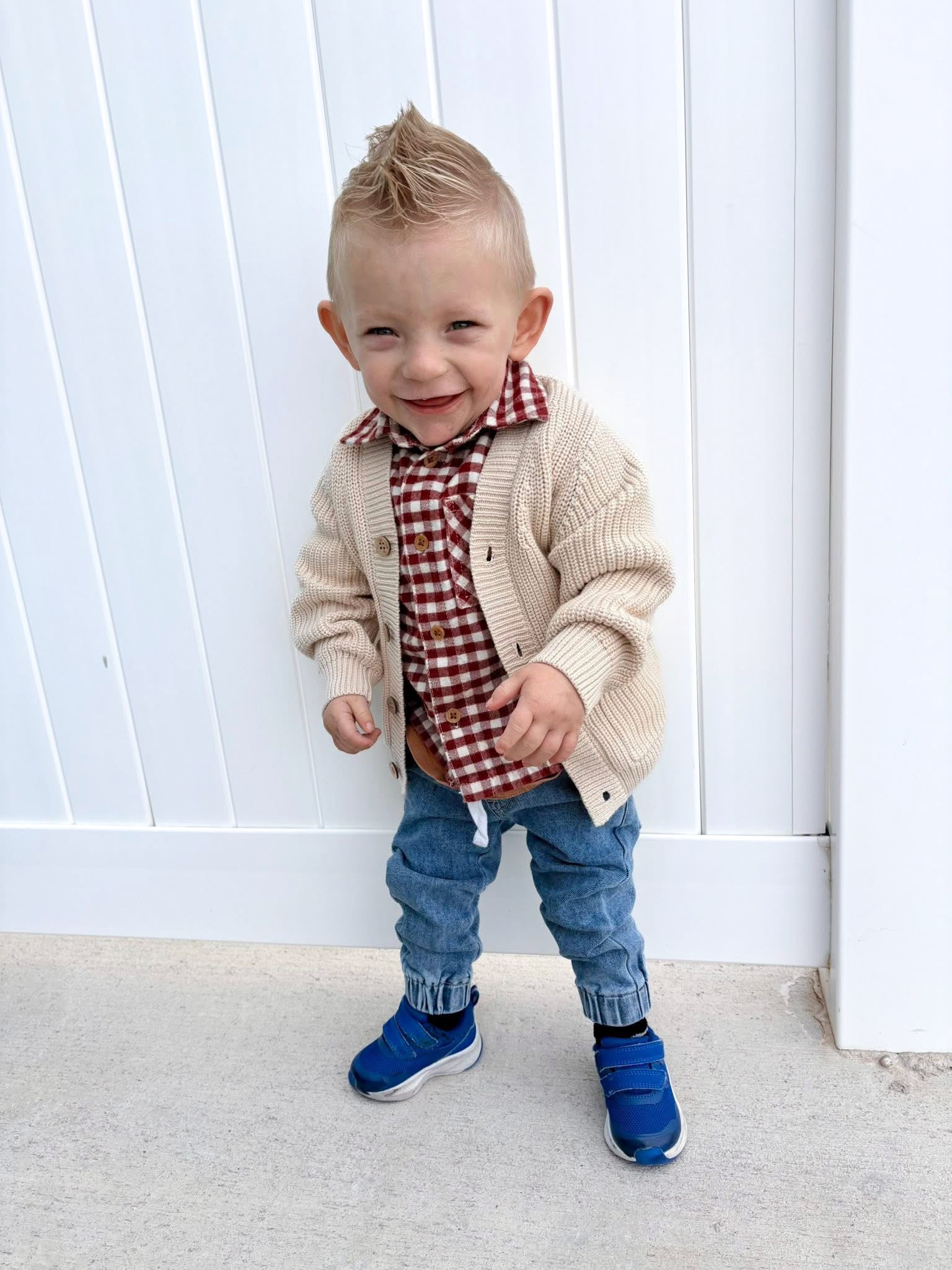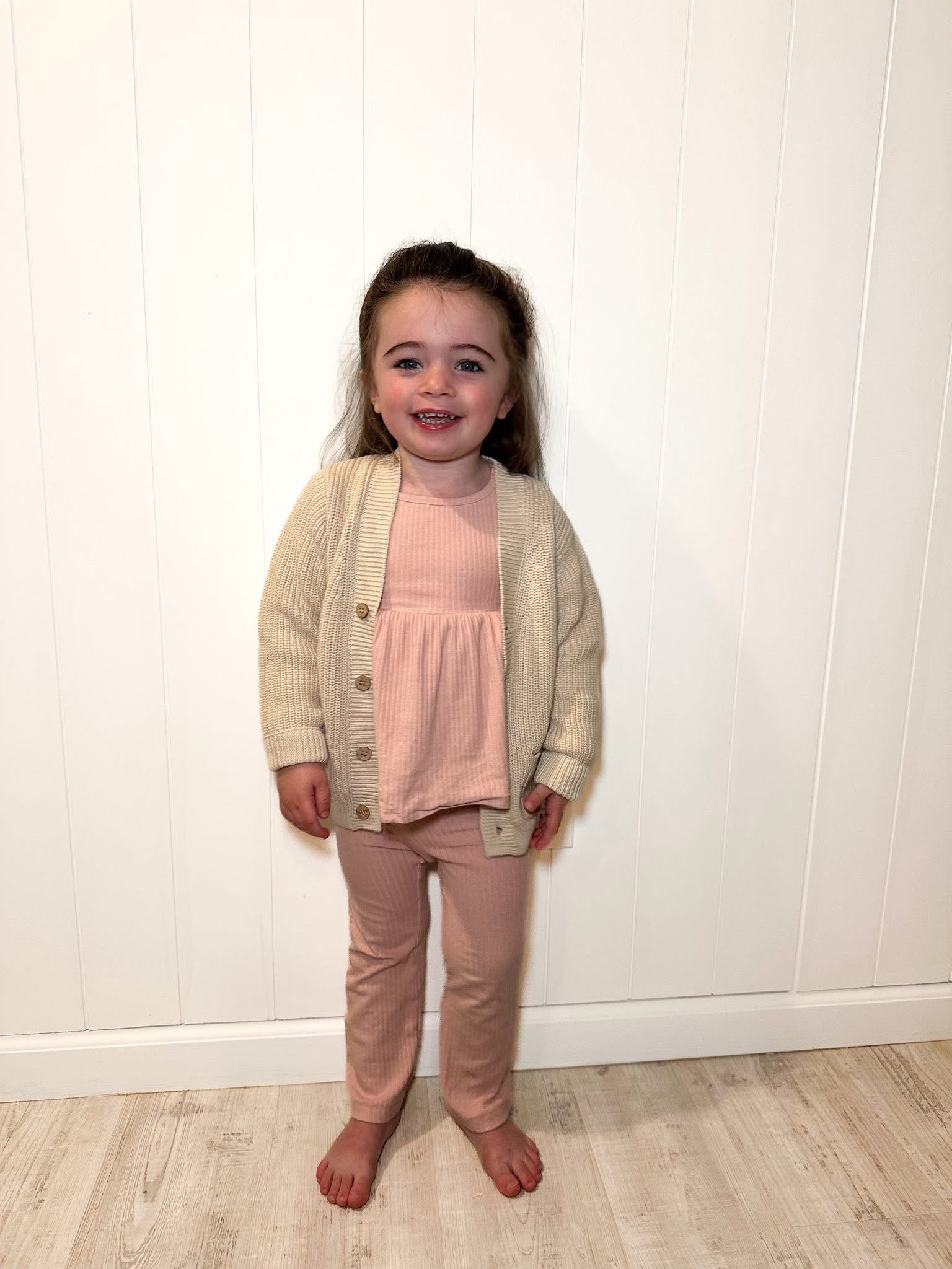 This cozy knit cardigan is the perfect layering piece for your little one. It features a soft, chunky knit texture with ribbed cuffs and hem, front patch pockets, and classic button down detailing. The warm, neutral cream color makes it easy to pair with flannels, tees, or everyday outfits. Comfortable, stylish, and versatile.