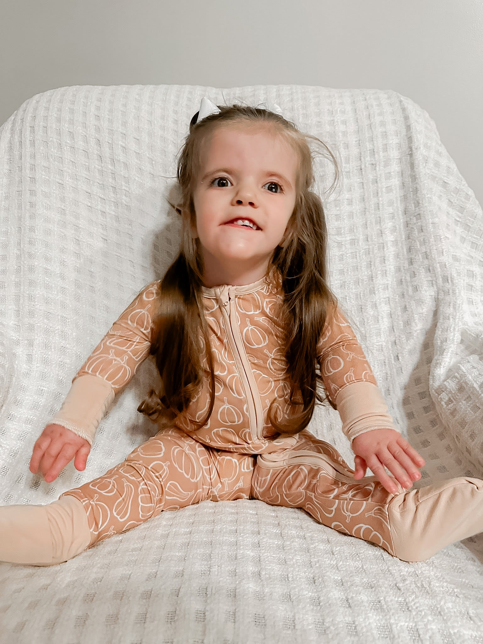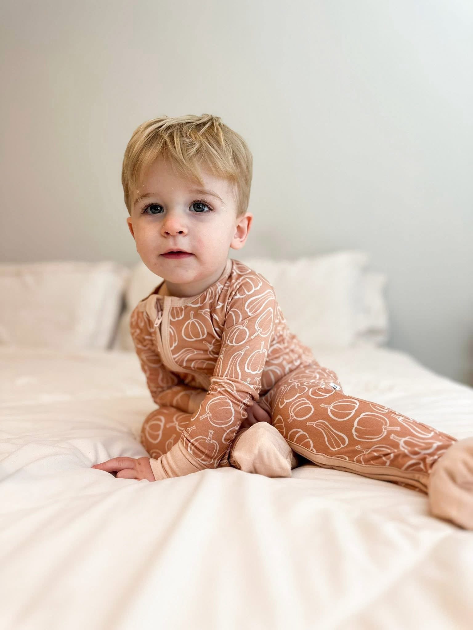 Our Autumn Harvest zippy romper is here to ensure your little is fall ready. Featuring a soft neutral base with pumpkin and gourd outlines, this buttery soft bamboo will keep your little one comfy all day long. Designed to provide max comfort with fold over hand + foot cuffs and a double zipper for easy diaper changes. Functional as it is darling! Perfect for the pumpkin patch, cozy naps and everyday lounging.