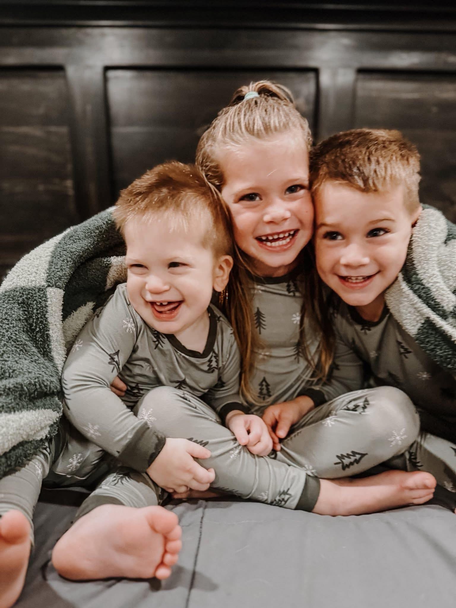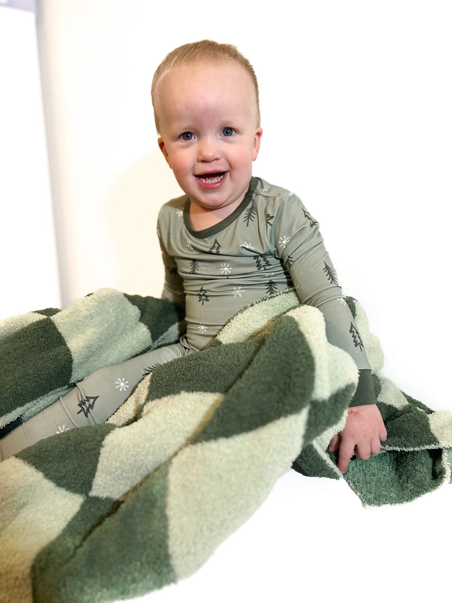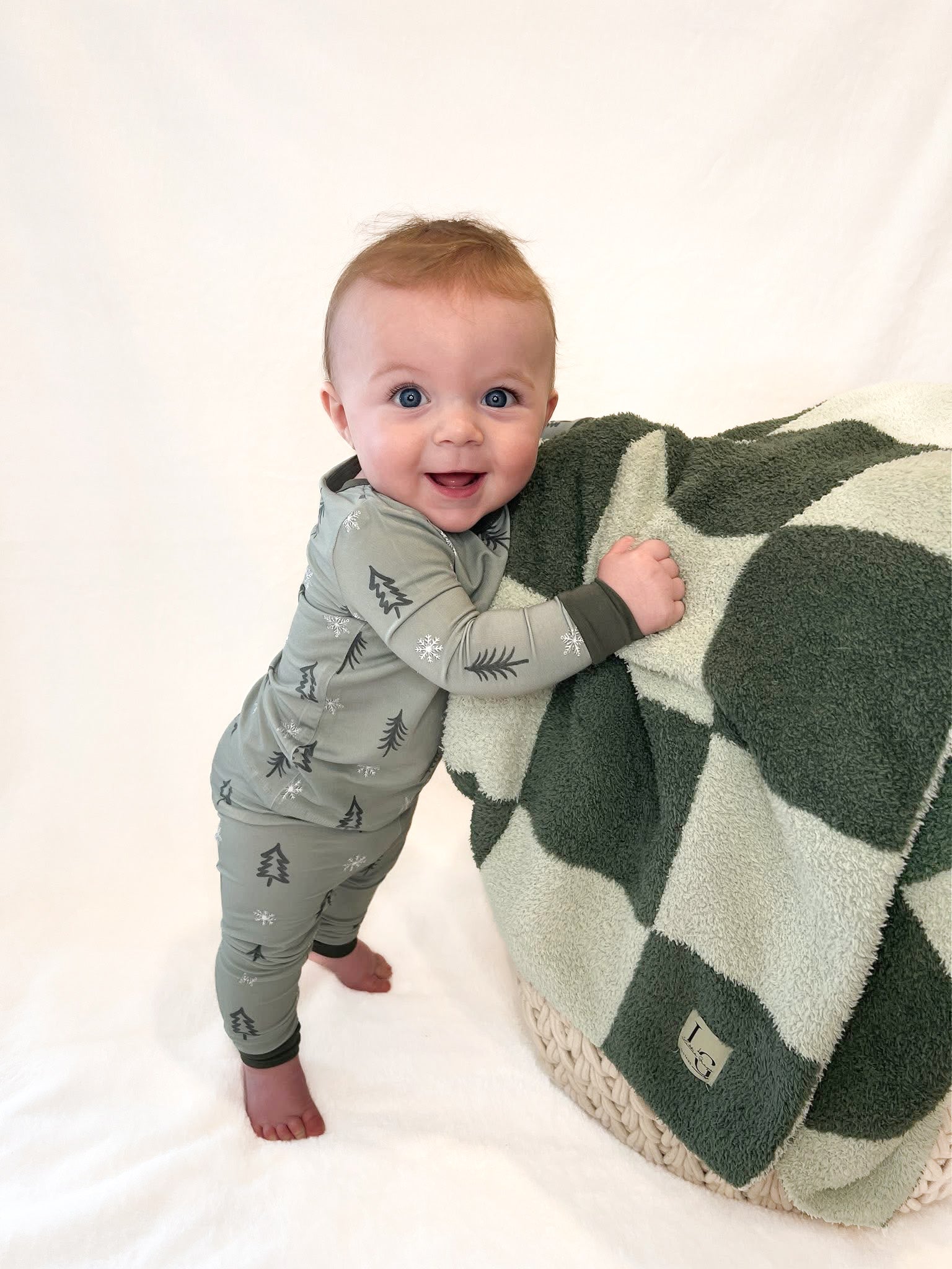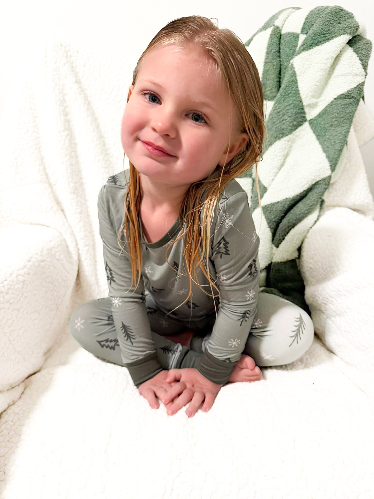 Snuggly, stretchy and seasonally sweet. Our extra soft bamboo two-piece comes in a muted sage green covered in woodland trees with a cozy, frosted snowflake winter vibe. The bamboo fabric makes it buttery soft with plenty of stretch, making it comfy for all day lounging, playing or bedtime snuggles. Gentle on sensitive skin and temperature regulating.