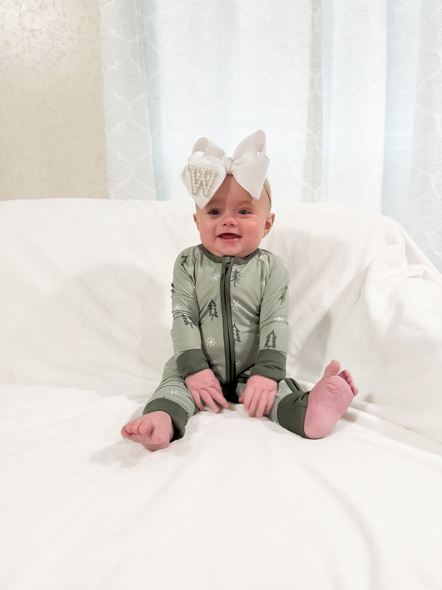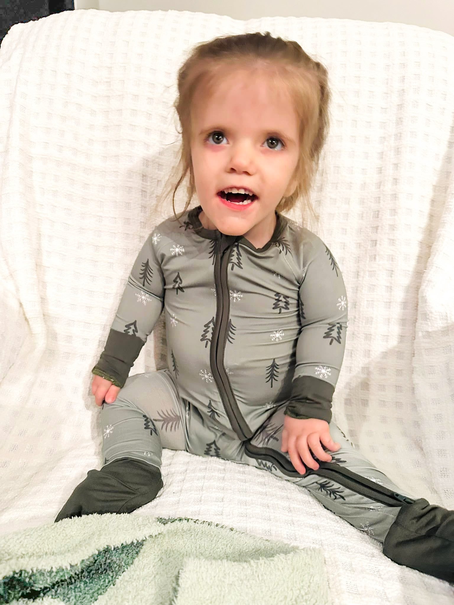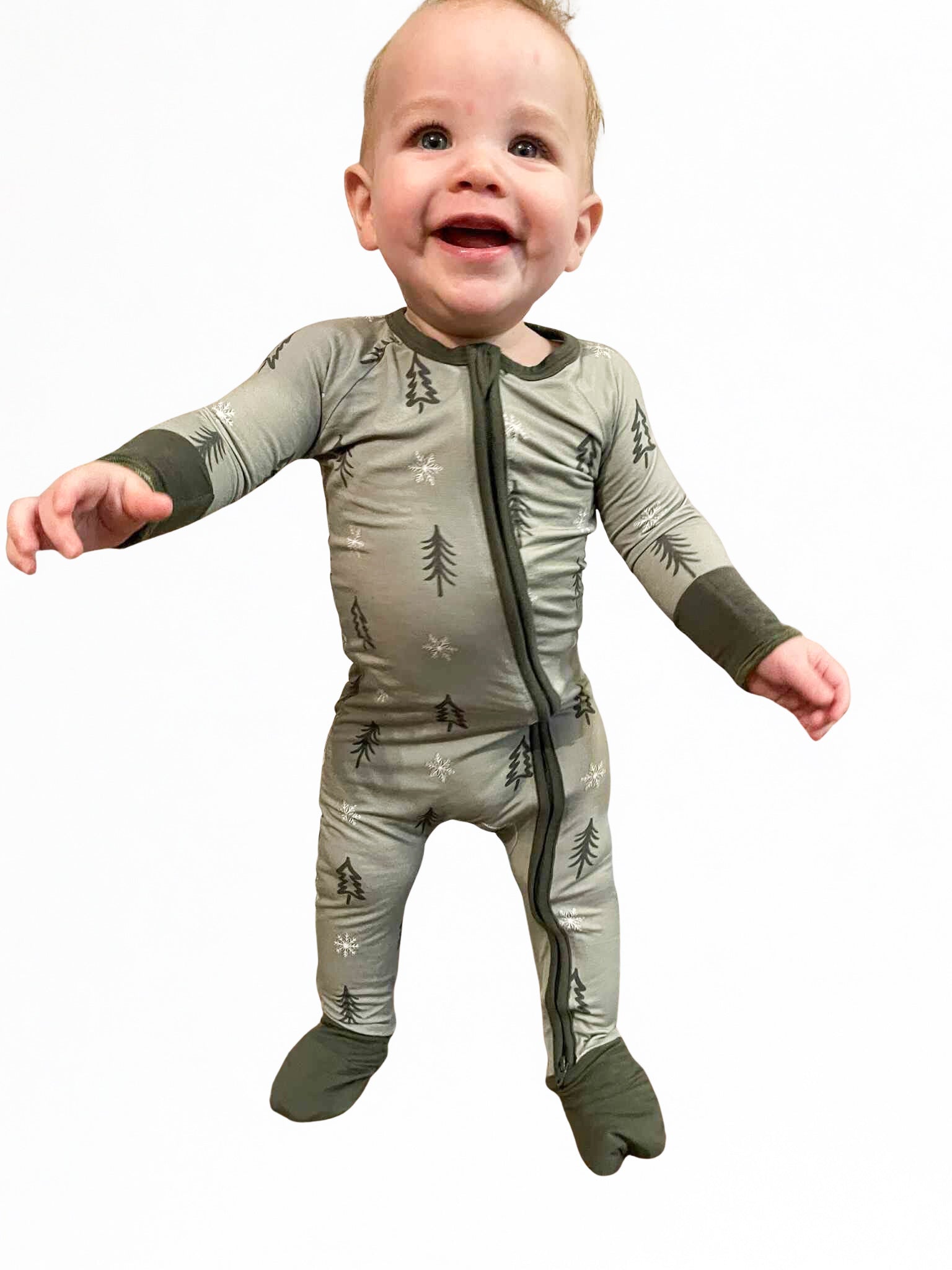 Snuggly, stretchy and seasonally sweet. Our extra soft bamboo zippy comes in a muted sage green covered in woodland trees with a cozy, frosted snowflake winter vibe. The bamboo fabric makes it buttery soft with plenty of stretch, making it comfy for all day lounging, playing or bedtime snuggles. Gentle on sensitive skin and temperature regulating.
